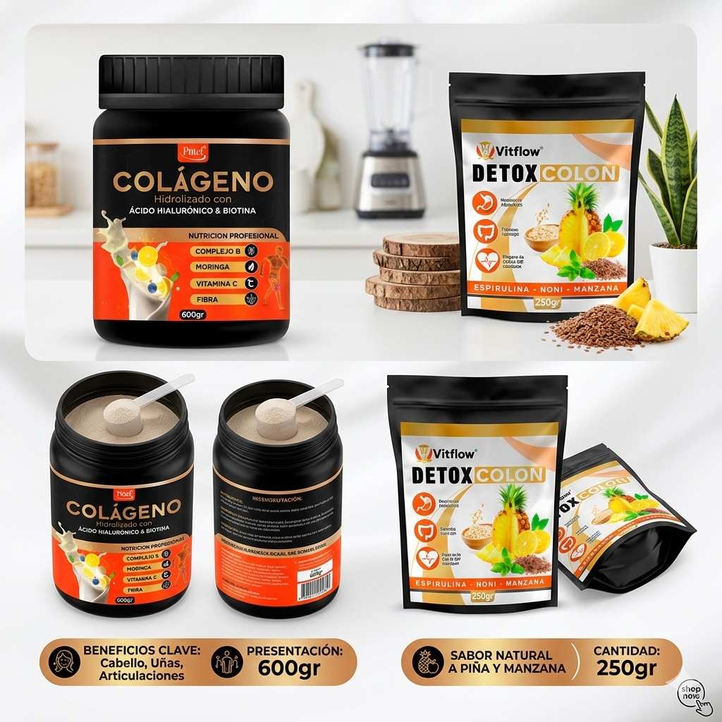 Pack Belleza + Detox Colágeno Fit&Plus 600 g + Detox Colon Vitaflow → ¡Piel radiante + abdomen plano en un solo pedido!