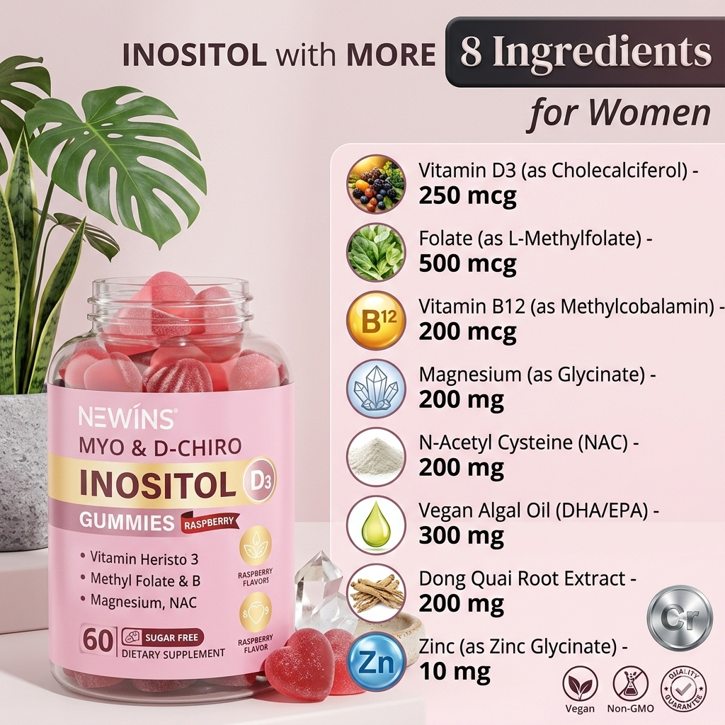 Nuestras gomitas de Inositol de Neviss están diseñadas específicamente para el bienestar integral de la mujer. Con una potente combinación de ingredientes clave, este suplemento es el aliado perfecto para quienes buscan equilibrio hormonal y apoyo metabólico sin complicaciones.